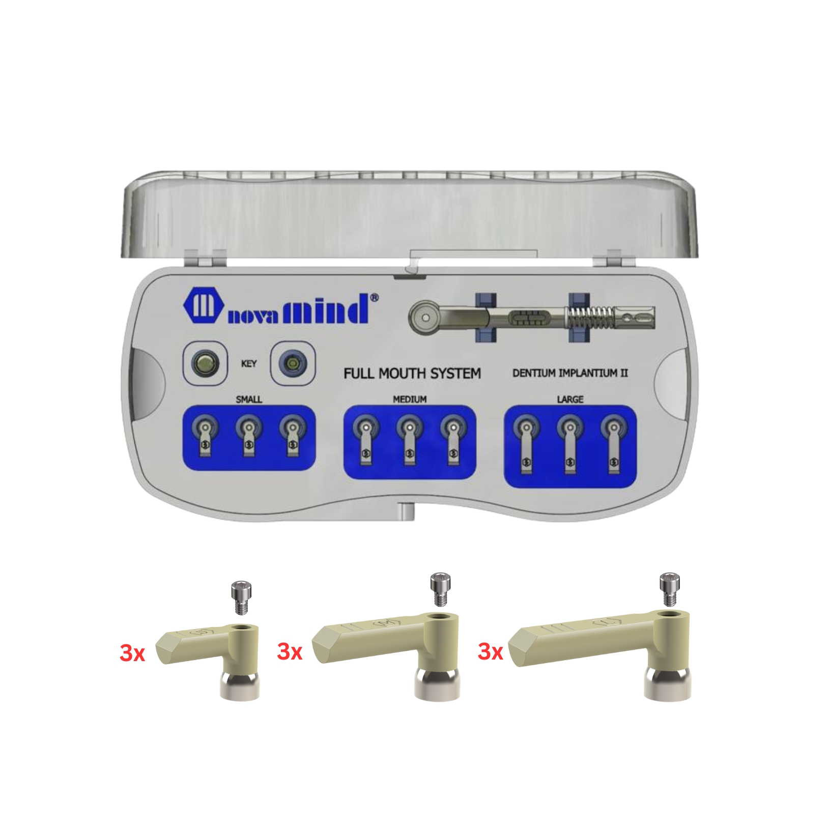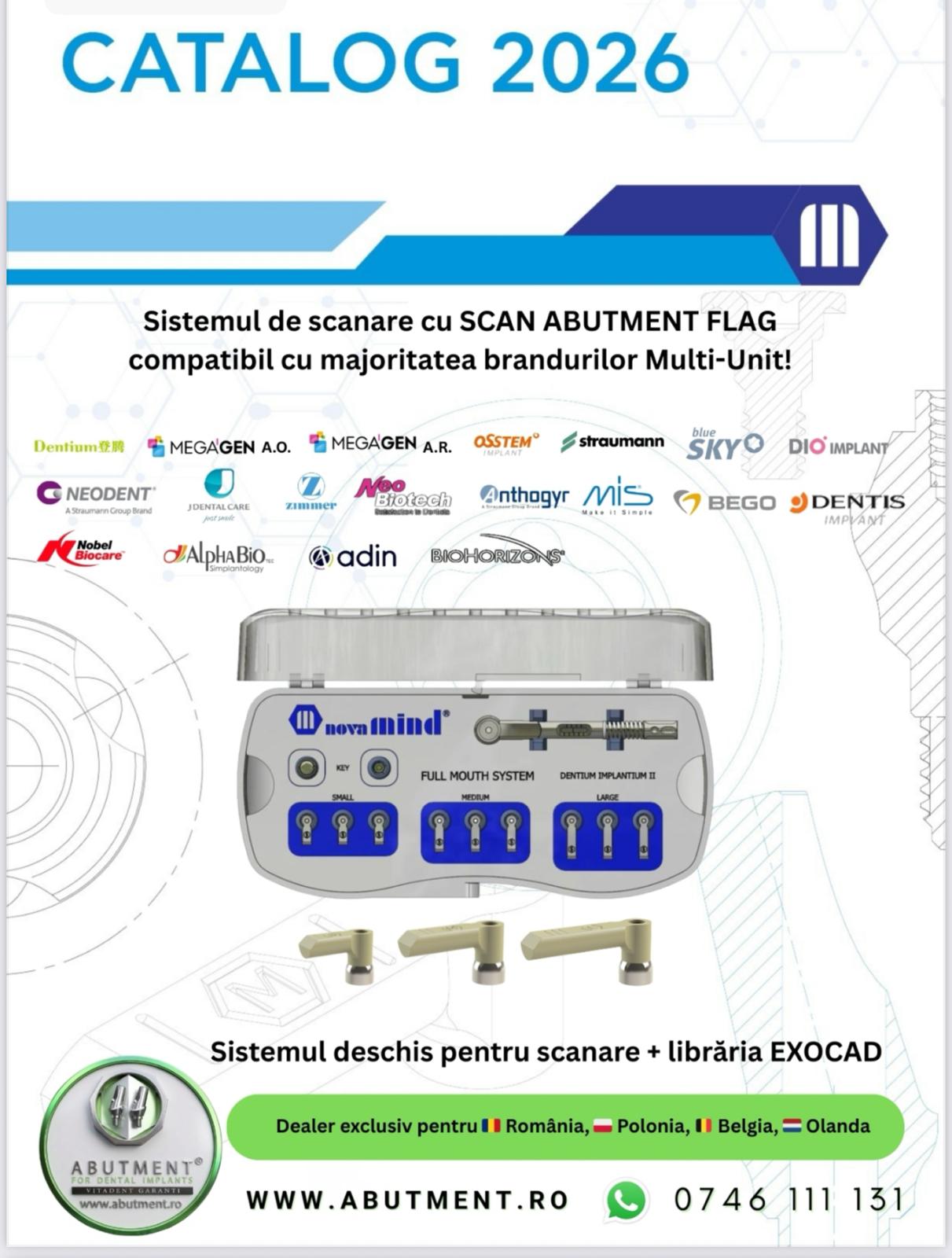 Este un sistem inovator de scanbody-uri digitale special conceput pentru protocoalele complete „all-on‑x” în stomatologia digitală. Sunt confectionate din materiale medicale certificate si sunt rezistente la peste 100 cicluri de sterilizare.Compatibilitate extinsă: biblioteci CAD/CAM ( Exocad, 3Shape), suport pentru laboratoare independente.Setul contine 9 bucati scanbody flag 3 small, 3 medium si 3 large si cutia de sterilizare  libraria CAD/CAM, iar la cerere si cheia dinamometrica.